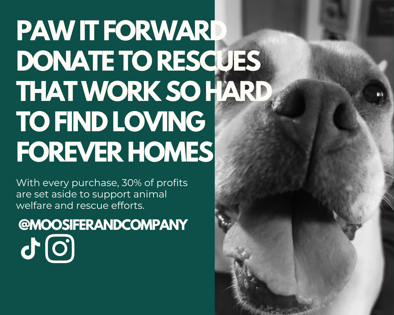 20% of profits from all sales on Moosifer & Company are donated to animal welfare and rescue efforts.